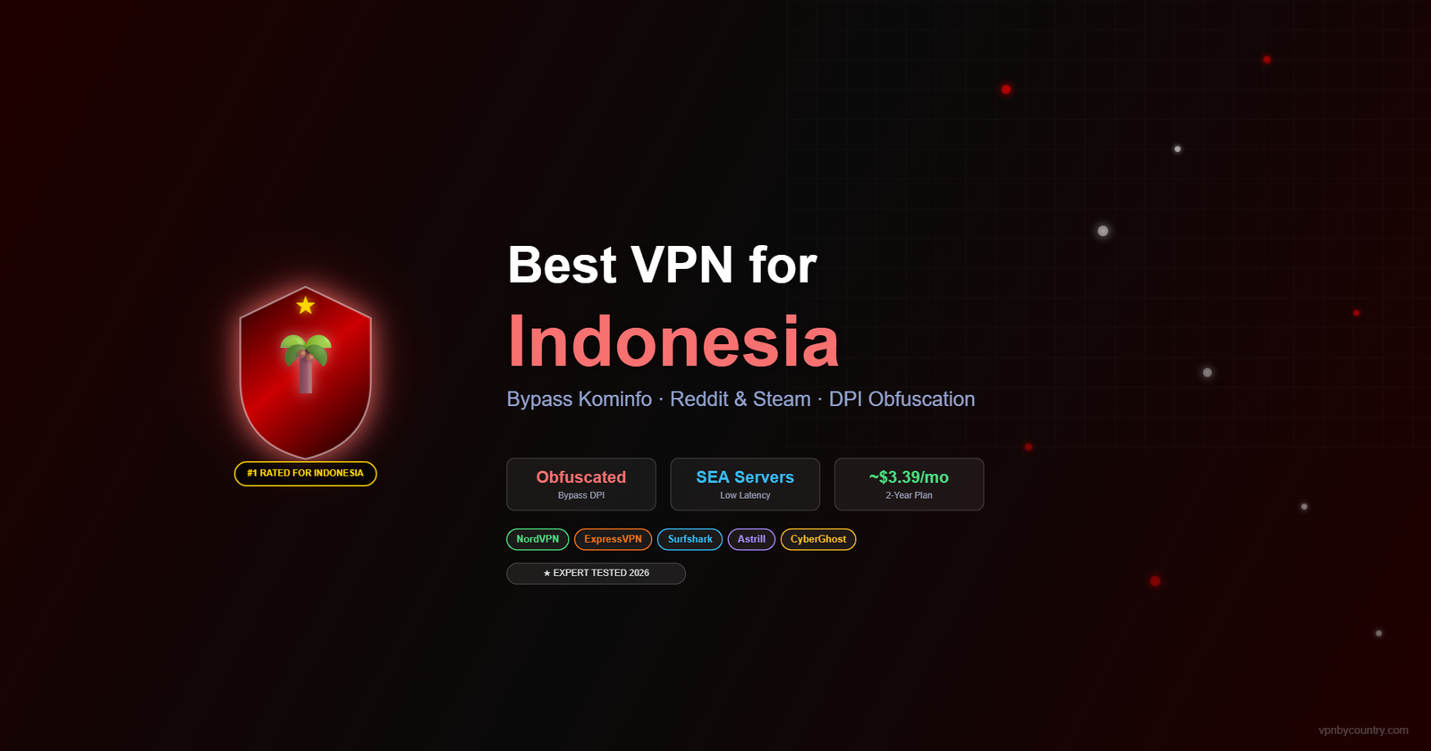 The best VPNs for Indonesia in 2026, tested for bypassing Kominfo censorship, unblocking Reddit and Steam. NordVPN with obfuscated servers is the top pick.