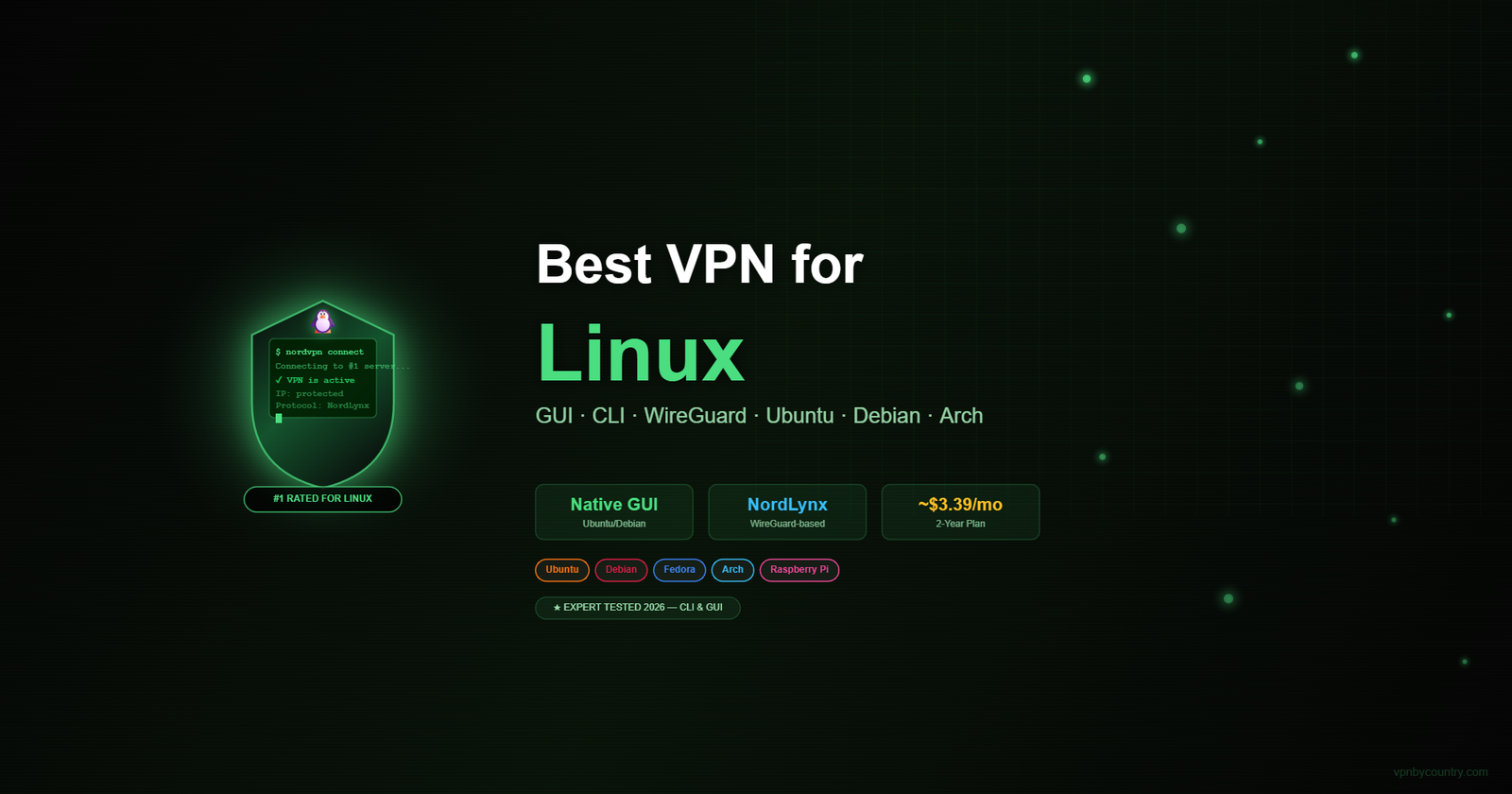 The best VPNs for Linux in 2026, tested on Ubuntu, Debian, Fedora, and Arch. NordVPN leads with a native GUI, NordLynx WireGuard, kill switch, and full CLI support.
