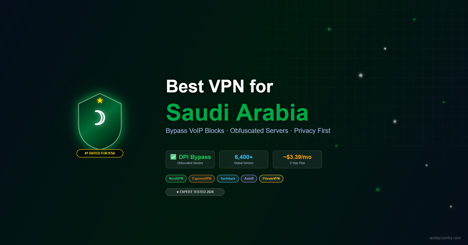 The best VPNs for Saudi Arabia in 2026, with obfuscation to bypass DPI and unblock VoIP. NordVPN leads with obfuscated servers that work reliably in KSA.