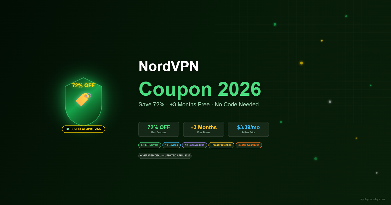 Get the best NordVPN coupon and discount code for 2026. Our exclusive link activates 72% off the 2-year plan plus 3 months free automatically — no promo code needed.