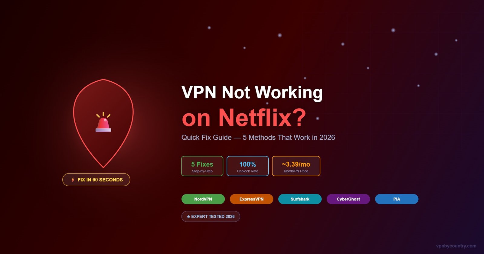 VPN not working on Netflix? Try these fixes: switch servers, clear cookies, use NordLynx protocol. Plus the only VPN with a 100% Netflix unblock rate in 2026.