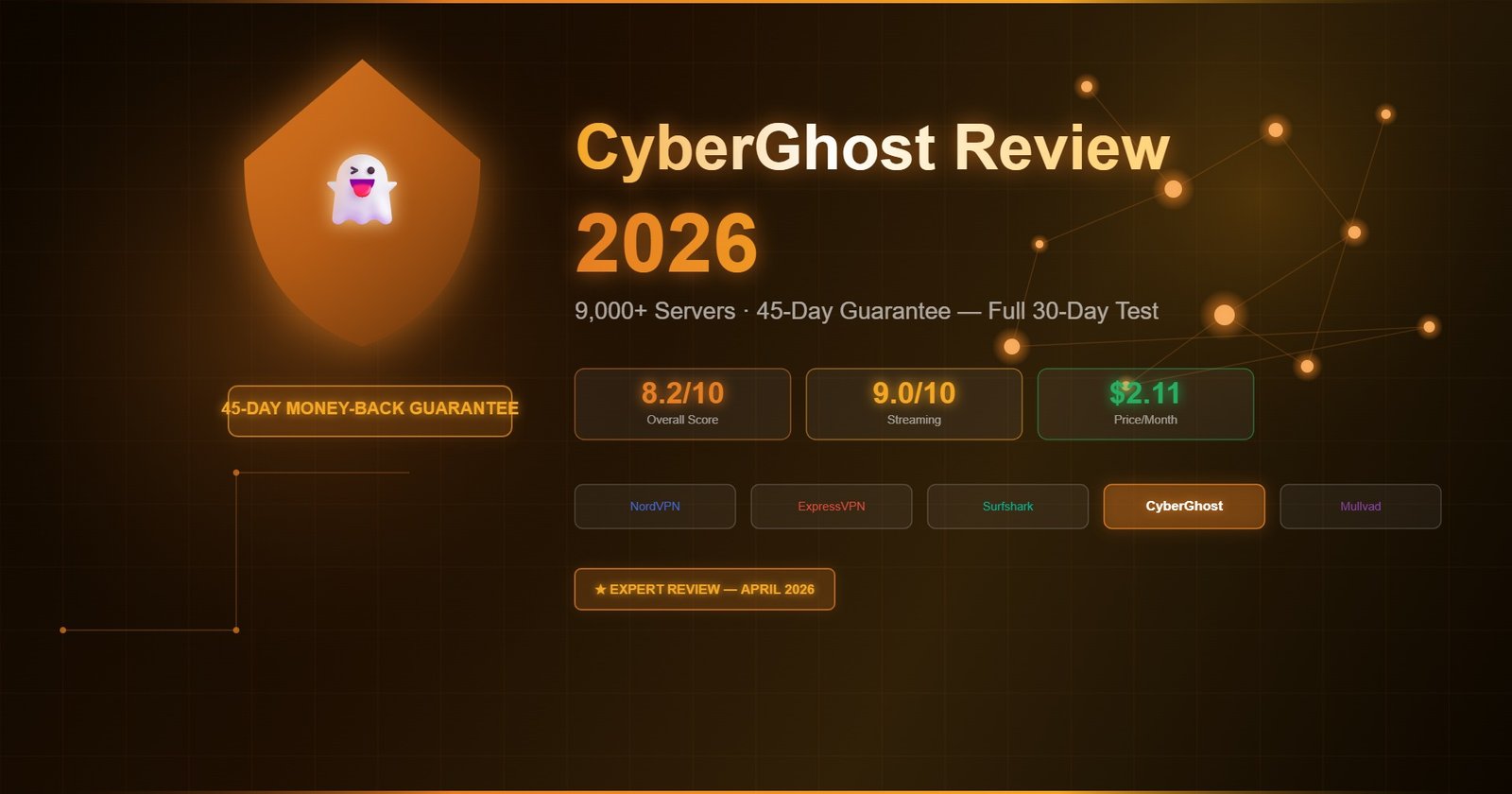 CyberGhost Review 2026: 9,000 Servers & 45-Day Guarantee (8.2/10)